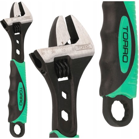 TORRO SILVER KLUCZ NASTAWNY SZWEDZKI - popularnie zwany Szwed stanowi bardzo rozsądną alternatywę dla standardowych kluczy płaskich. Wykonany jest ze stali chromowo-wanadowej (CR-V). Ergonomiczna dwukomponentowa antypoślizgowa rękojeść gwarantuje komfort pracy i pewny chwyt. Wypalana laserowo miara pozwala na dokładną regulację. W rączce umiejscowione są trzy otwory dające większe spektrum użytkowania narzędzia.