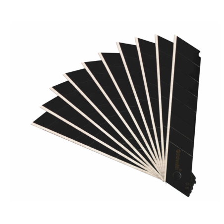 Komplet 10 stalowych ostrzy łamanych przeznaczony do stosowania w nożach z funkcją wysuwania. Produkt dedykowany jest do cięcia w materiałach: karton, tapeta, wykładzina, tkanina plandekowa, folia drukarska, folia PCV i innych.