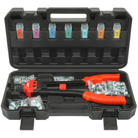 Nitownica ręczna do nitonakrętek M3-M12 marki VERKE. Nitownica przeznaczona do wykonywania połączeń materiałów za pomocą nitonakrętek. Wykonuje połączenia materiałów za pomocą wewnętrznie gwintowanej tulei. Pozwala to na przykręcanie dodatkowych elementów wkrętami do metalu lub śrubami. Wykonane z wytrzymałej stali narzędziowej chromowo-molibdenowej CrMo. Rękojeści pokryte antypoślizgową gumowaną okładziną. Całość w wygodnej, praktycznej walizce.