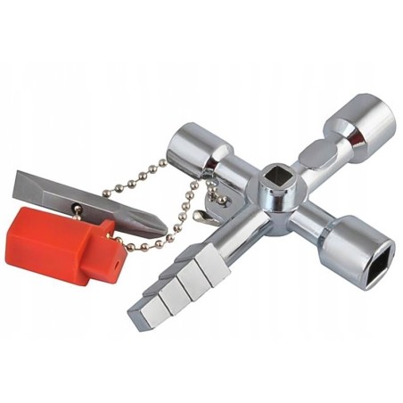 Klucz z końcówkami do otwierania i zamykania większości skrzynek oraz szaf sterowniczych (grzewczych, elektrycznych, sanitarnych). W zestawie z kluczem znajduje się łańcuszek z adapterem oraz bitaem dwustronnym - płaskim oraz krzyżowym.