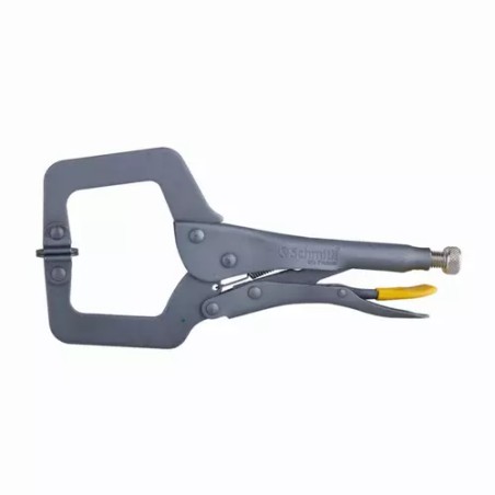 Szczypce zaciskowe, spawalnicze typu C. Szczypce zaciskowe o profilu dużej klamry służące do punktowego ściskania materiałów przy spawaniu, wierceniu, nitowaniu. Specjalny kształt pozwala na zaciskanie materiałów o różnych i nieregularnych kształtach. Zbudowane są z mechanizmu zapadkowego, który blokuje się i umożliwia stały nacisk, śruby regulującej siłę nacisku oraz przycisku zwalniającego mechanizm zapadkowy.